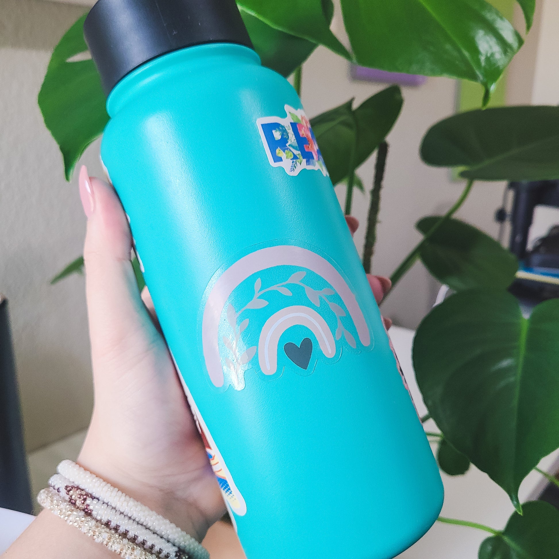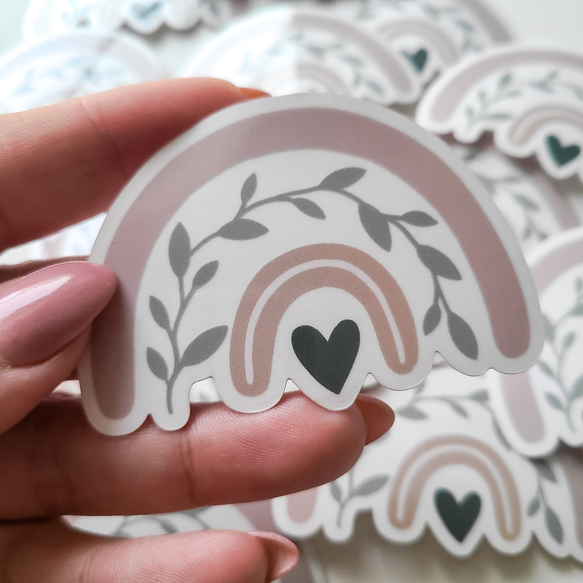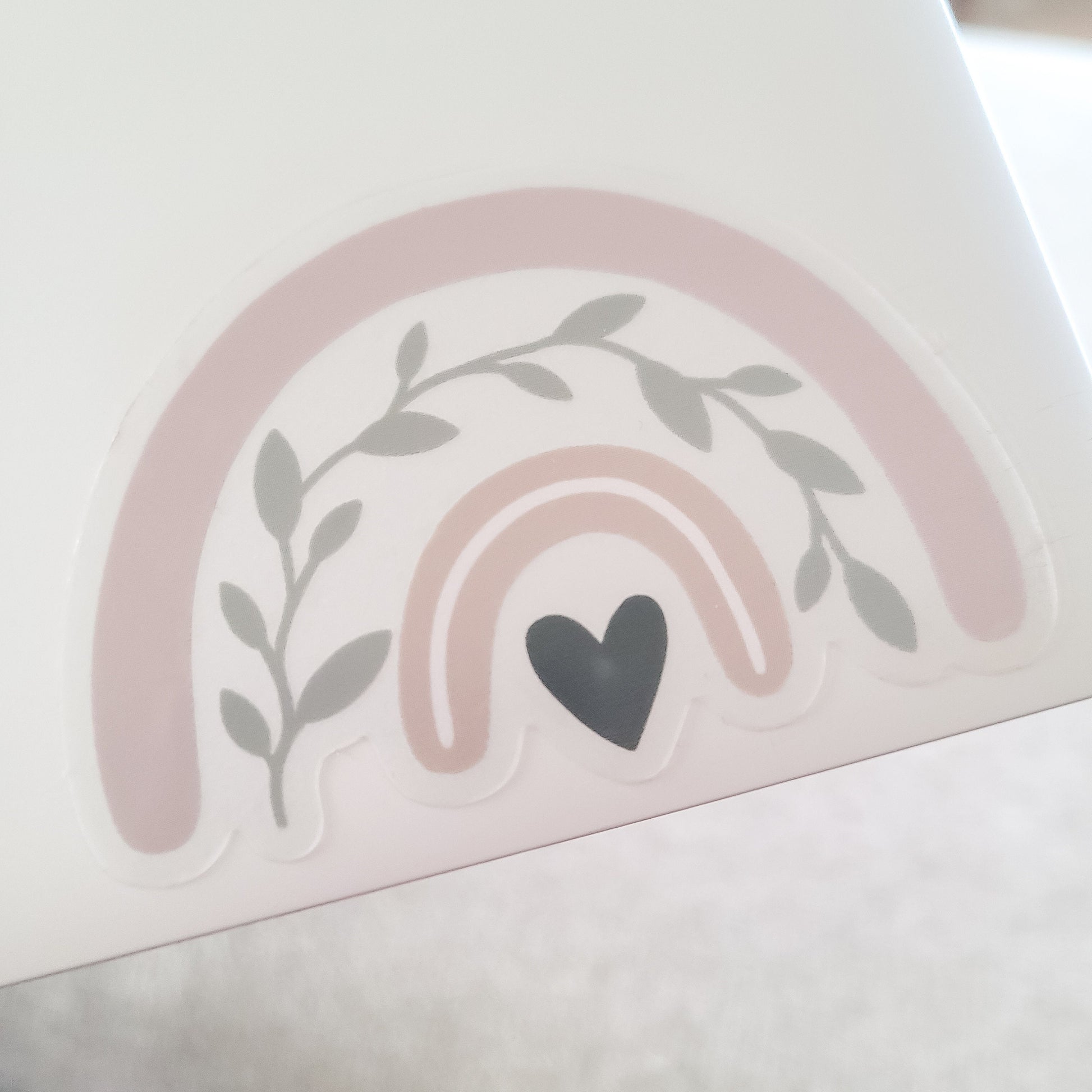 Add a little boho style to any water bottle, notebook, laptop, mugs, car decals, and so much more! This rainbow sticker has a clear backing with gorgeous pastel shades of pink and green with plant vine and heart details!