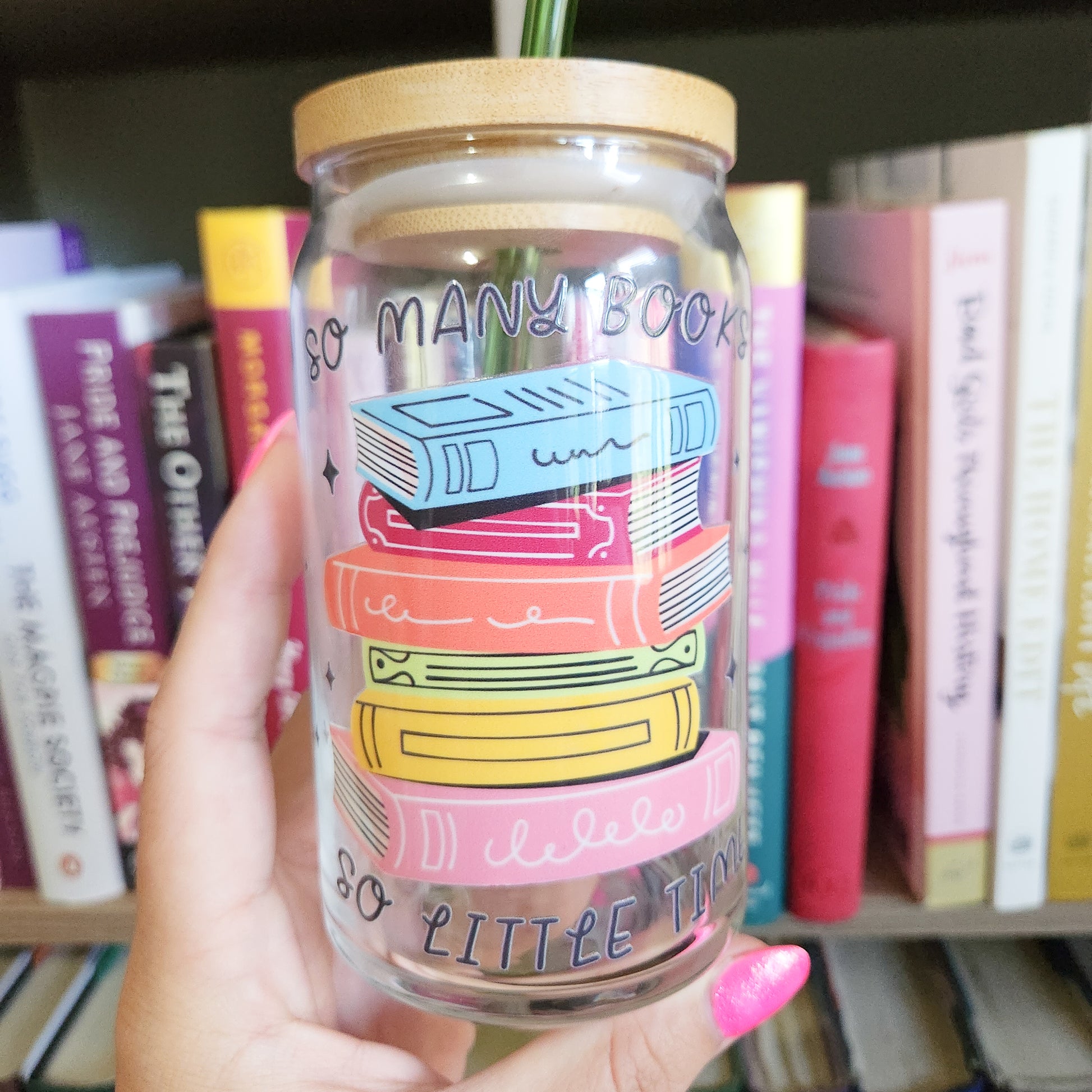 No shelf control? Sounds about right! This bundle deal includes our best selling 'No Shelf Control' design on an Ash Grey sweatshirt, a glass can cup with the colorful 'So Many Books, So Little Time' design, a bamboo lid and glass straw, and a 'Books Are My Love Language' sticker! Regular value $64 total.