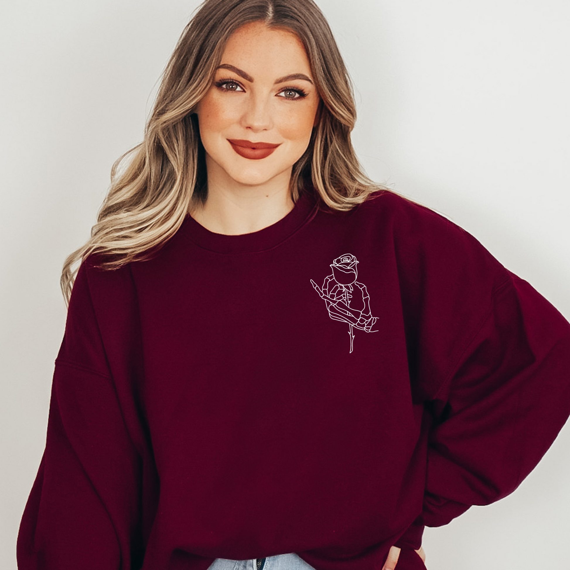This design has a skeleton hand and rose front "pocket" detail and "The Lovers" tarot card design across the back!