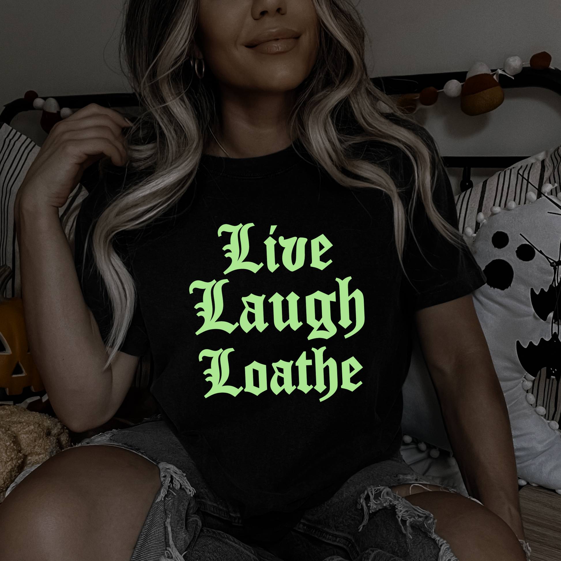 Live Laugh Loathe đź–¤ Design is white and glows in the dark